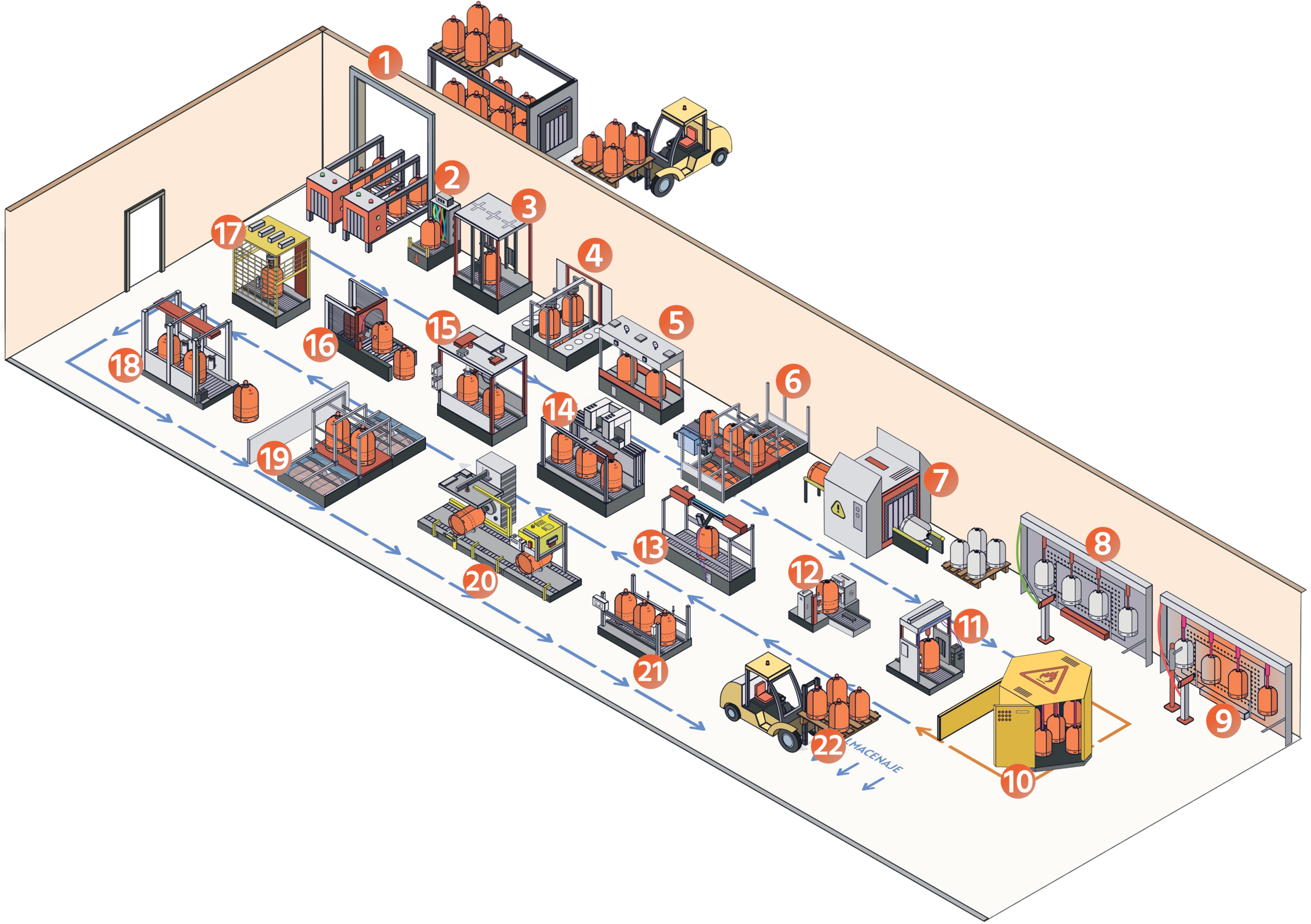 Mediante máquina de serigrafía automática, se posicionan los envases de forma horizontal mediante manipuladores y se imprime el logo y las instrucciones especificadas por Repsol Butano.